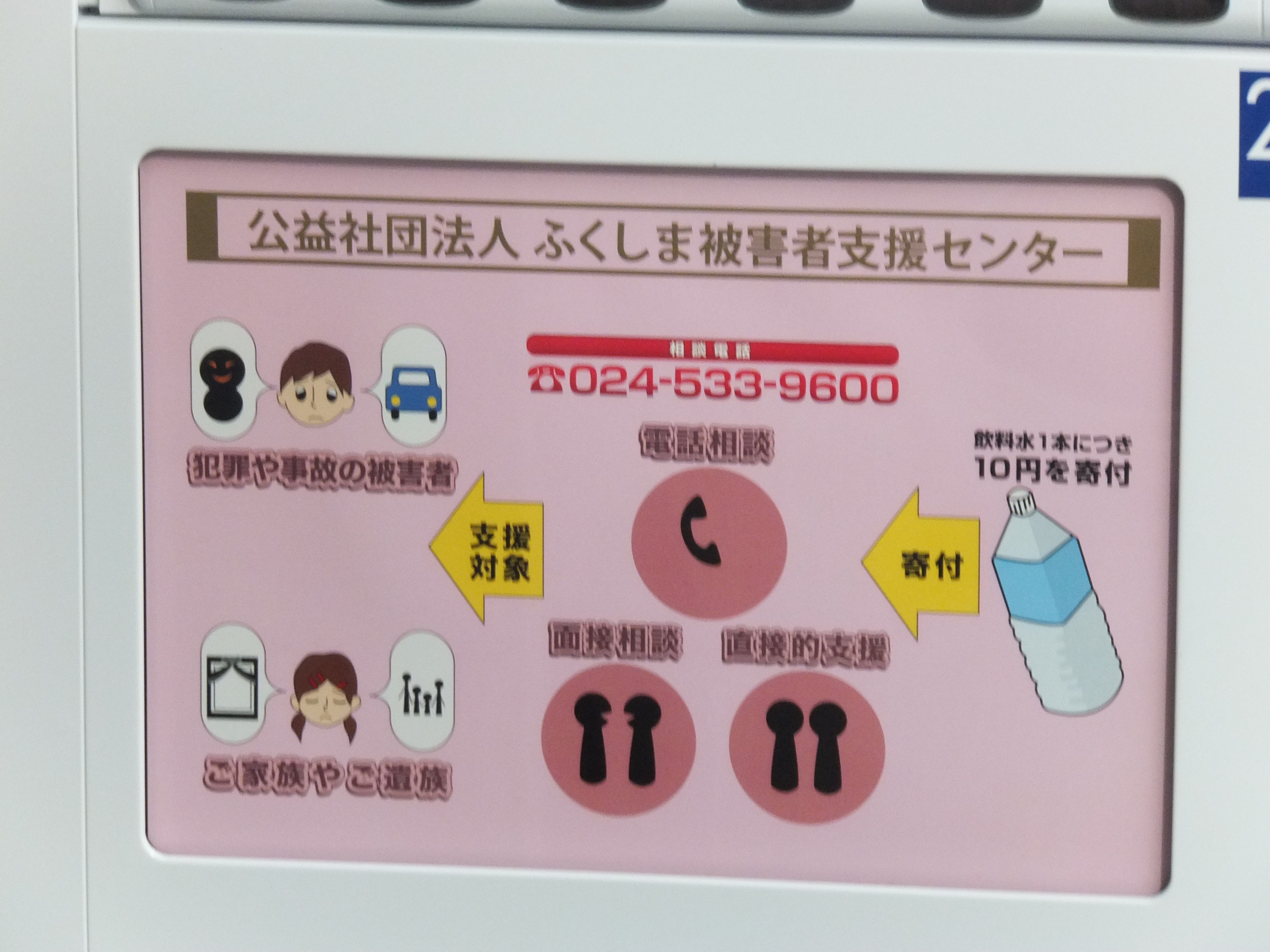 ふくしま被害者支援センターでは、寄付型自動販売機の設置拡大を推進しております。皆様のご協力をお願いします。 寄付型自動販売機設置のねらいは、大きく二つあります。 一つは、本県のオリジナルデザインを採用し、県内に数多く設置することにより県民の皆さんへの被害者支援活動の普及を図ること。そして、設置いただいた企業 ・ 団体、あるいは商店等のイメージの向上を図り、ひいては企業において重視されている CRS 活動(社会貢献活動)に貢献していこうとするものです。 その二は、寄付型自動販売機から飲料水を購入した場合、1本につき10円が被害者支援活動に寄付されます。この販売機を利用された方は、購入金額の中から寄付を支払うこととなり、大きな社会貢献をしていることになります。 既に、福島銀行本店をはじめ県内に4台設置していますが、今後は5か年計画で県内各地に200台設置を目標として進めてまいります。寄付型自動販売機設置にご協力をいただける方は、気軽にお申込みください。 なお、この寄付型自動販売機は、認定NPO法人全国被害者支援ネットワーク ・ 日本財団のご協力をいただいています。