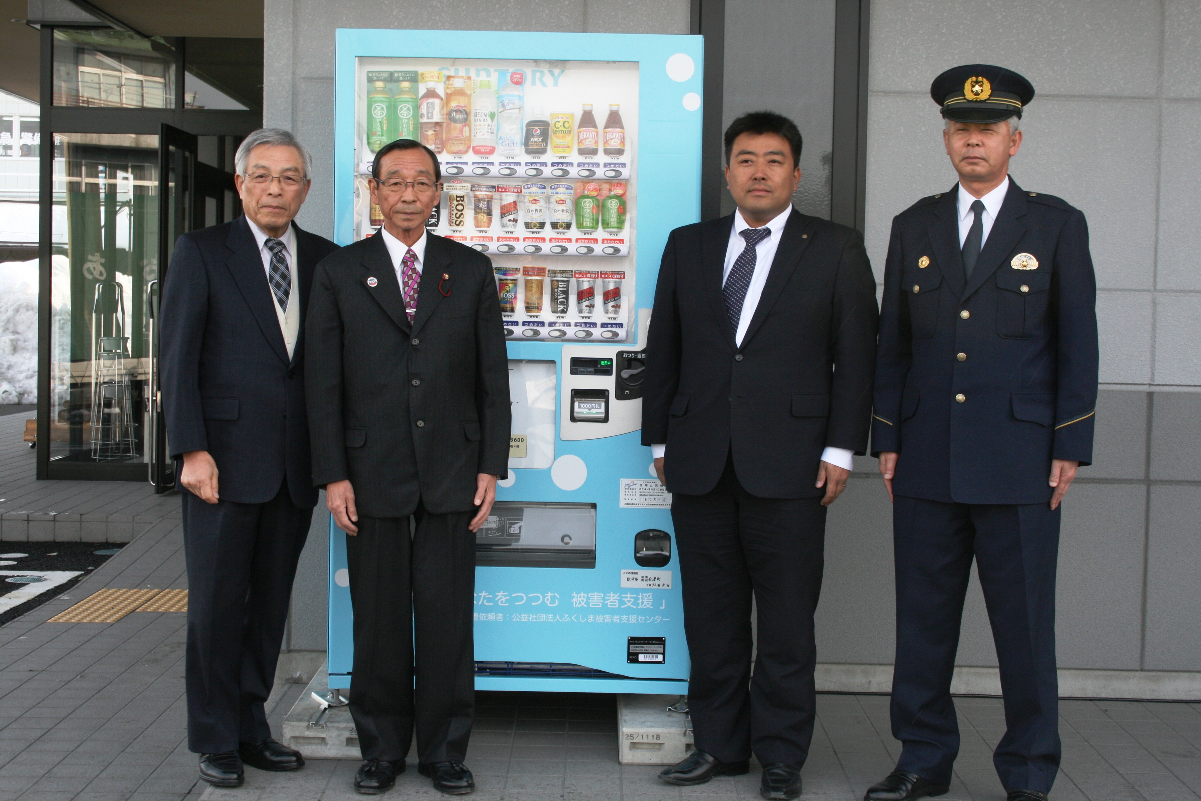 当センターでは、平成25年度から5か年計画で、合わせて200台の寄付型自動販売機の整備を目標に設置拡大事業を進めております。特別養護老人ホーム宮川荘は1月28日、宮川荘の佐藤弘一施設長、会津美里地区被害者支援ネットワークの桜井宏信会長及び会津若松警察署会津美里分庁舎の峯岸正行分所長の立会いのもと、㈱あおき白河斎苑は2月25日、㈱あおきの佐藤大代表取締役社長、白河警察署犯罪被害者支援ネットワークの邊見友雄会長、白河警察署の竹中淳一署長及び当センターの廣木康二専務理事の立会いのもと、それぞれ設置式のセレモニーを行いました。寄付型自動販売機には、被害者支援をイメージするラッピングデザインと広告スペースデザインが施されている本県独自のもので、設置者は4作品の中から好みのデザインを選定することができます。このオリジナルデザインは、当センターが主催したデザインコンテストに入選した「郡山情報ビジネス専門学校」と「国際アート&デザイン専門学校」の学生さんが制作した4作品です。今回設置されたほか、既に福島銀行本店、郡山情報ビジネス専門学校及び国際アート&デザイン専門学校に4台設置されております。