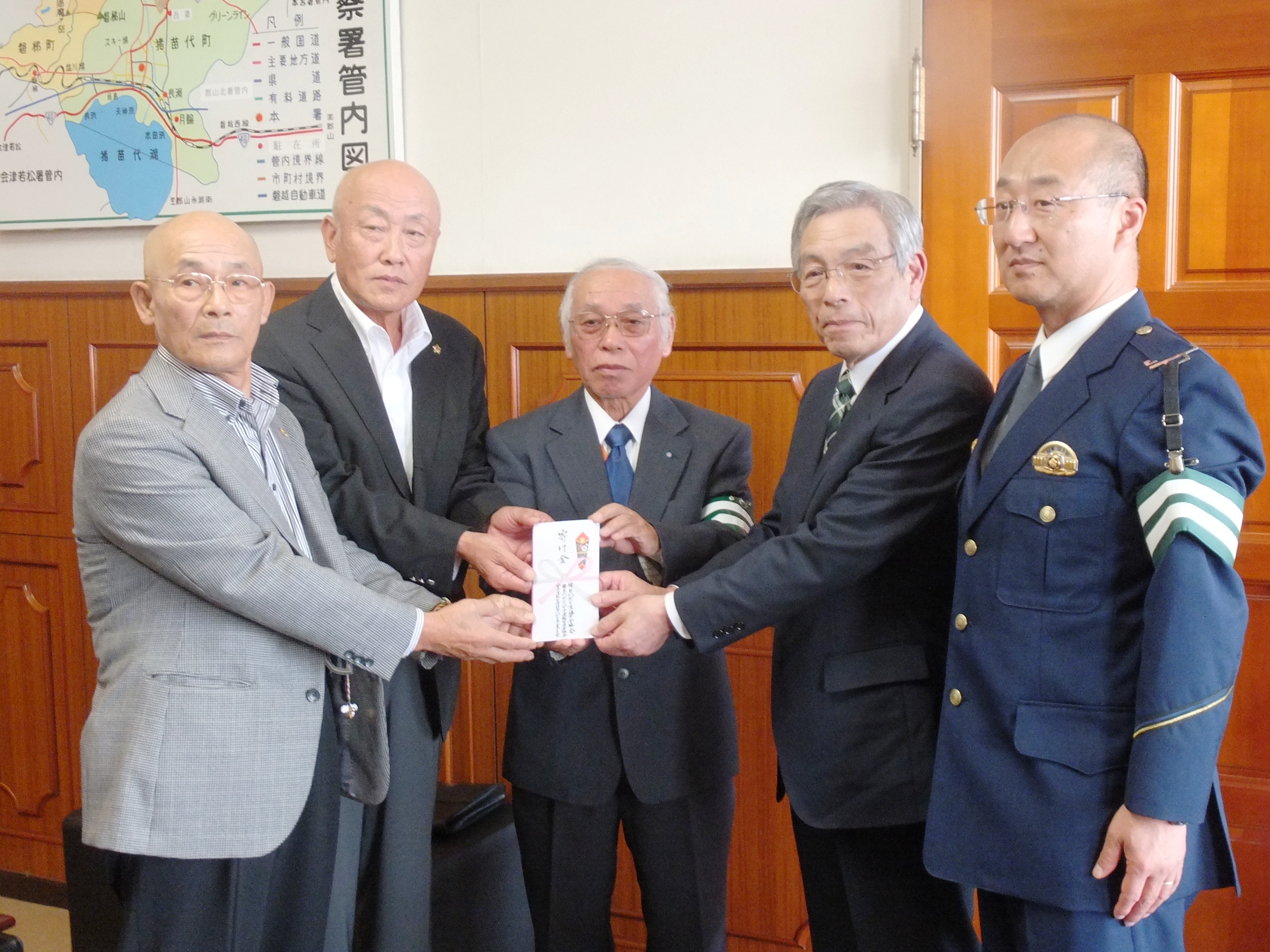 社会貢献事業の一環として、猪苗代地区の交通安全協会(会長:鈴木榮太郎氏)、安全運転管理者協会(会長:渡部一男氏)及び安全運転管理事業主会(会長:渡部 茂氏)の交通三団体から寄付の申し出があり、10月21日(月)午後3時から、猪苗代警察署署長室において贈呈式が執り行われました。贈呈式には、猪苗代地区交通安全協会の鈴木榮太郎会長、猪苗代地区安全運転管理者協会の渡部一男会長、安全運転管理猪苗代地区事業主会の大川原勝人副会長が、当センターからは廣木康二専務理事がそれぞれ出席し、横田雄也警察署長の立会いのもと、寄付金20万円が贈呈されました。贈呈されました寄付金は、春と秋の2回、猪苗代地区交通三団体が開催しておりますチャリティゴルフコンペに参加されました皆様から募りました善意の募金です。また、猪苗代地区交通三団体からは、平成19年度に当センターが発足して以来、賛助会員としてご支援をいただいております。寄せられました寄付金は、犯罪や事故の被害者、そのご家族・ご遺族の方々への支援活動、当センターの活動を広く県民の皆様に周知していただくための広報啓発活動等に活用させていただきます。